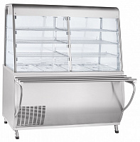 - Холодильные витрины закрытого типа поддерживают готовые блюда в температуре до +15 °C. Внутри непрерывно циркулирует холодный воздух, равномерно обдувая каждую полку. В зависимости от модели в основании – нейтральный или охлаждающий модуль.