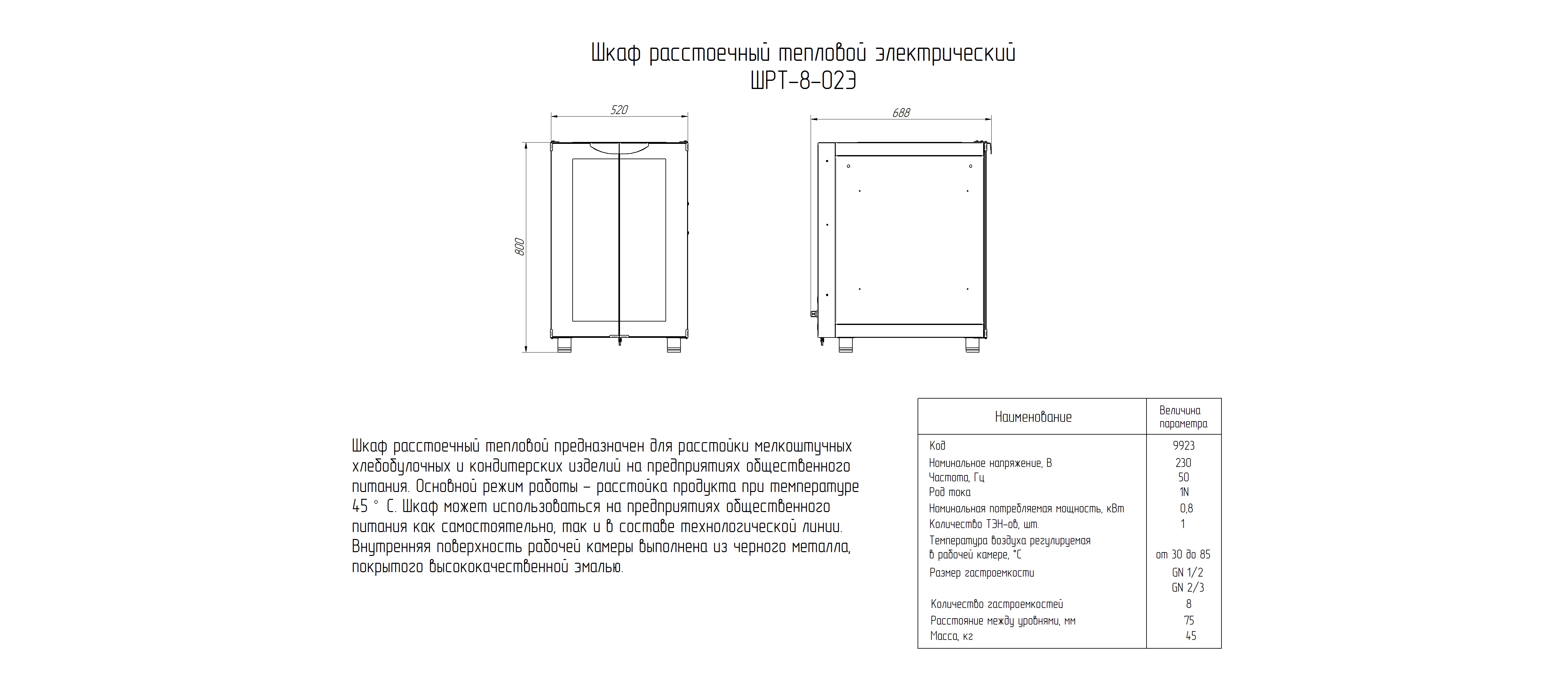Расстоечный шкаф Abat ШРТ-8-02Э используется в пекарнях, кондитерских и на предприятиях общественного питания и торговли для расстойки тестовых заготовок, в процессе которой тесто увеличивается в объеме и приобретает ровную поверхность, восстанавливается его пористость. Модель оснащена лотком для сбора конденсата и регулируемыми по высоте ножками.